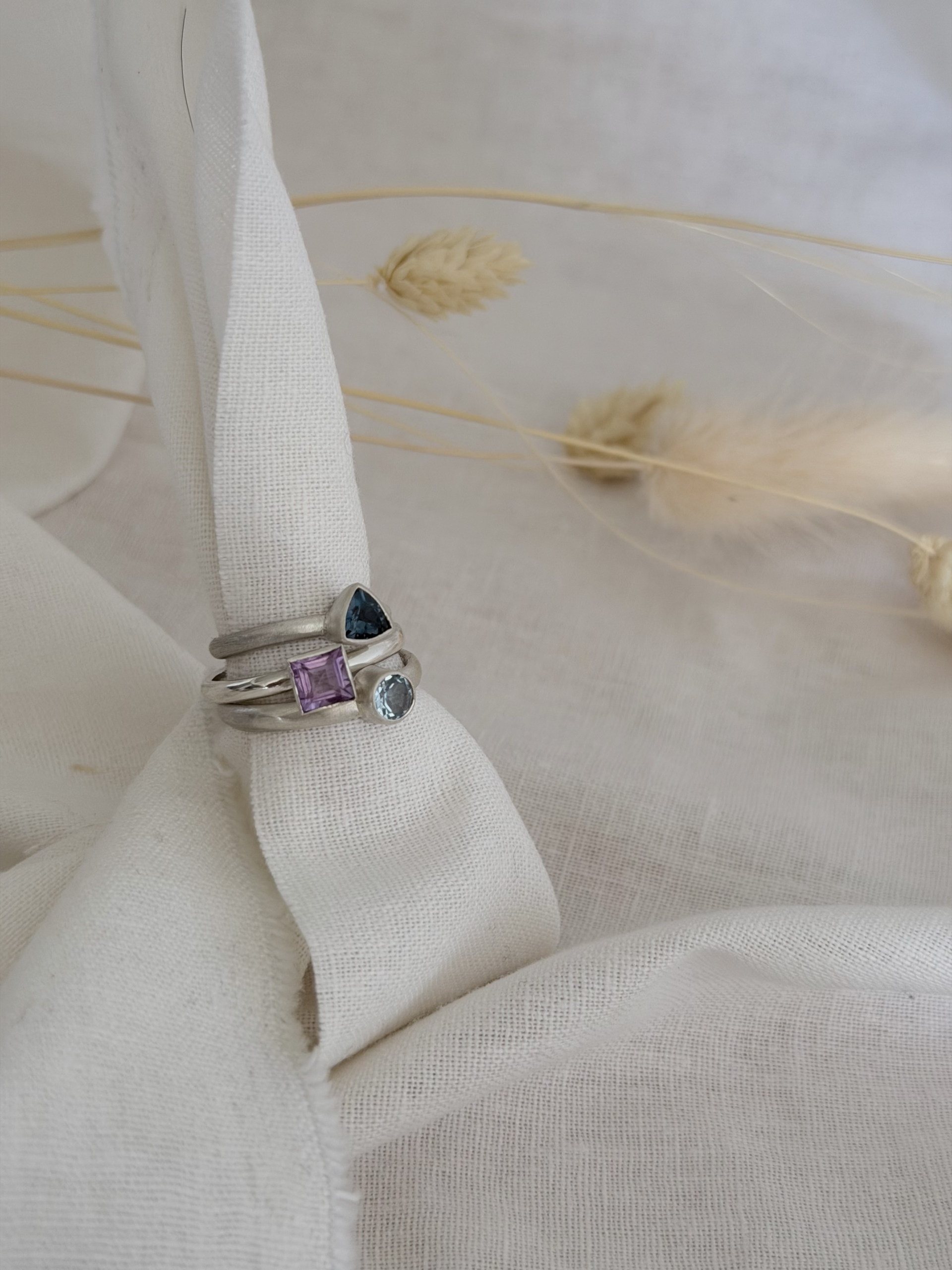 In the centre of the stack sits a striking square-cut Amethyst – glowing with rich purple hues and a contemporary, geometric edge.
