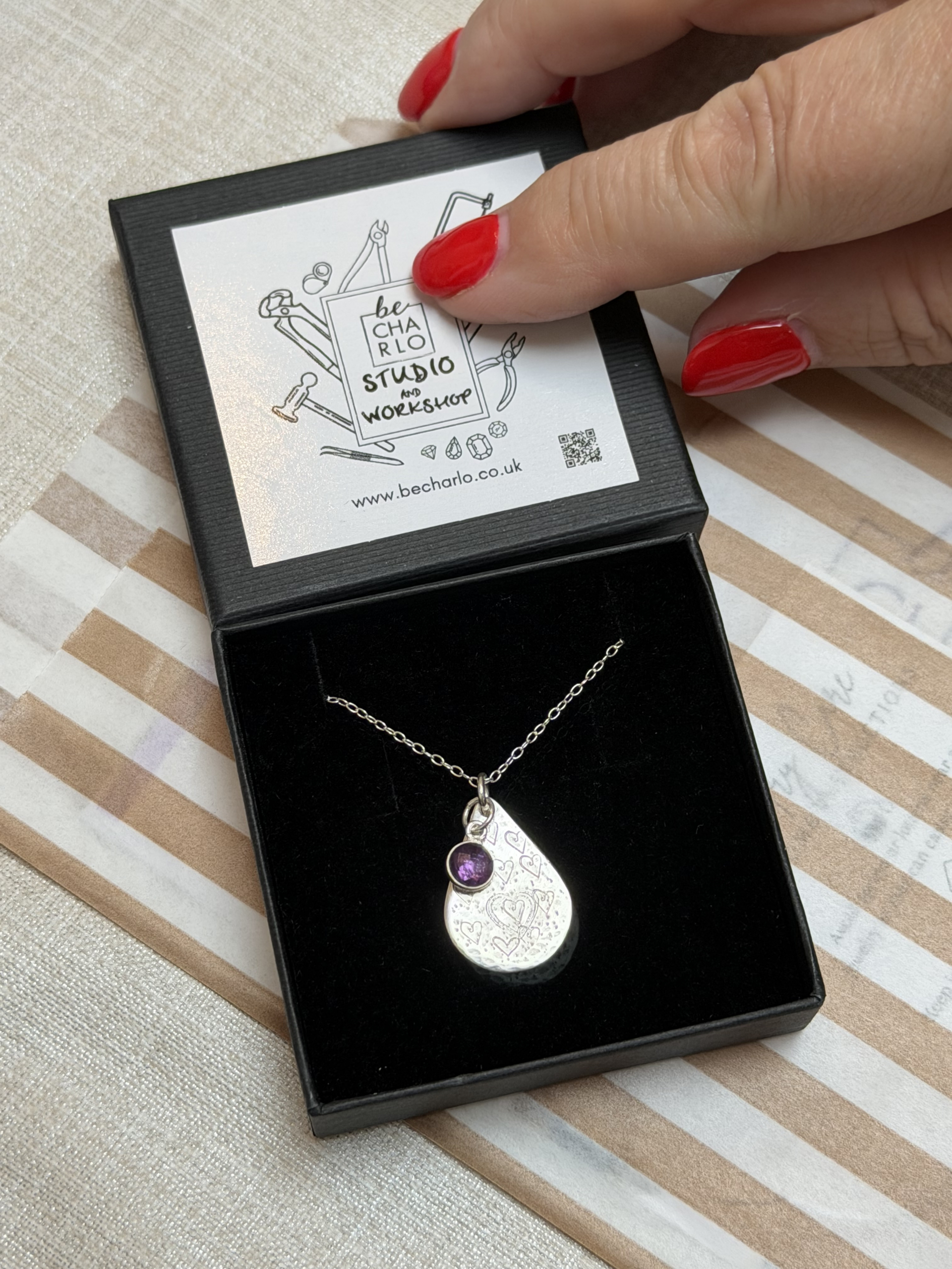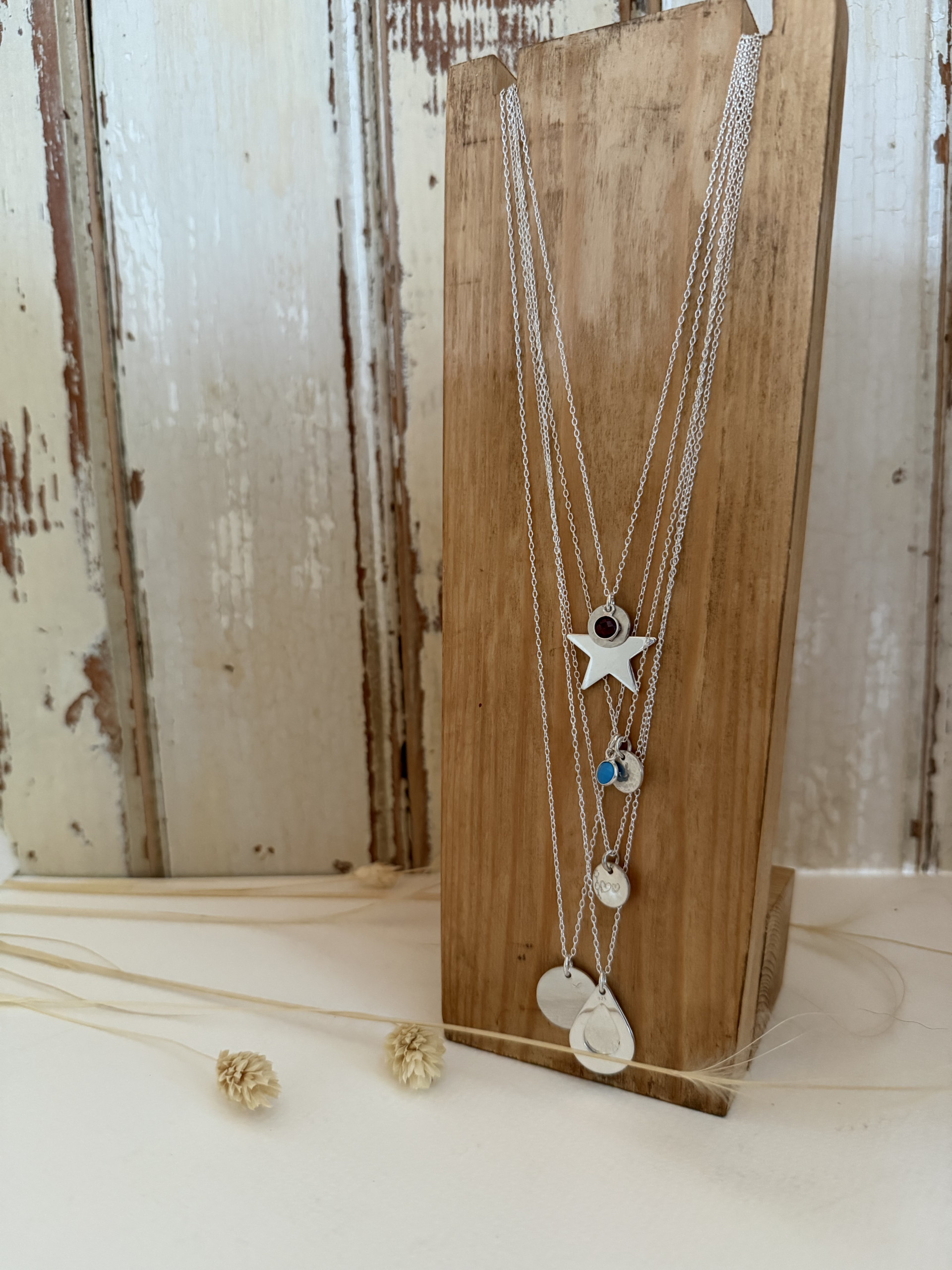 Hand-stamp a sterling silver disc (or star), choose your chain length (16″ or 18″), and add an optional gemstone charm.