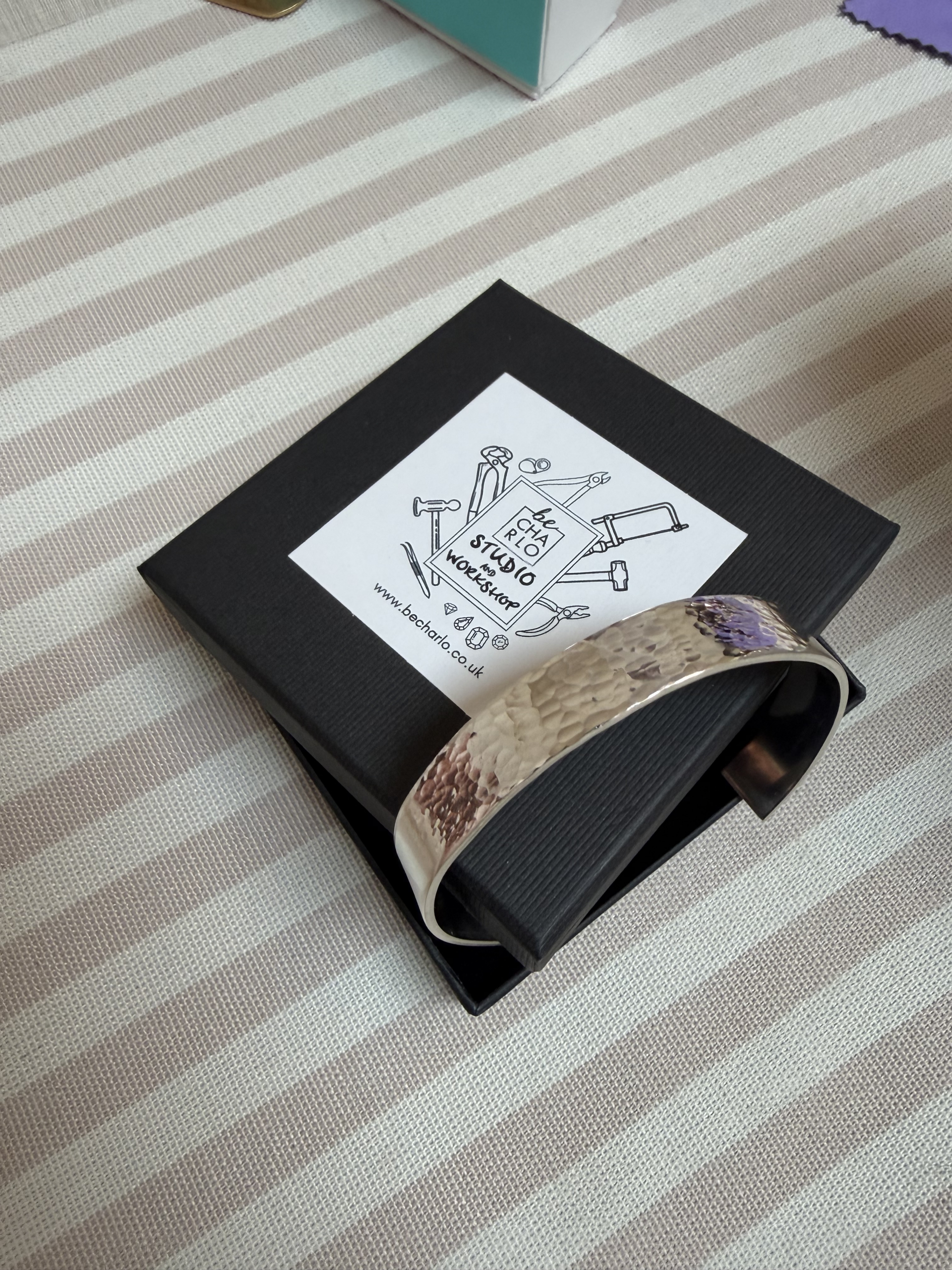 Create your own sterling silver ring (or a small set). Learn how to measure, saw, solder and texture silver for a piece that’s uniquely yours.✨ Silver Bangle – £90 per person