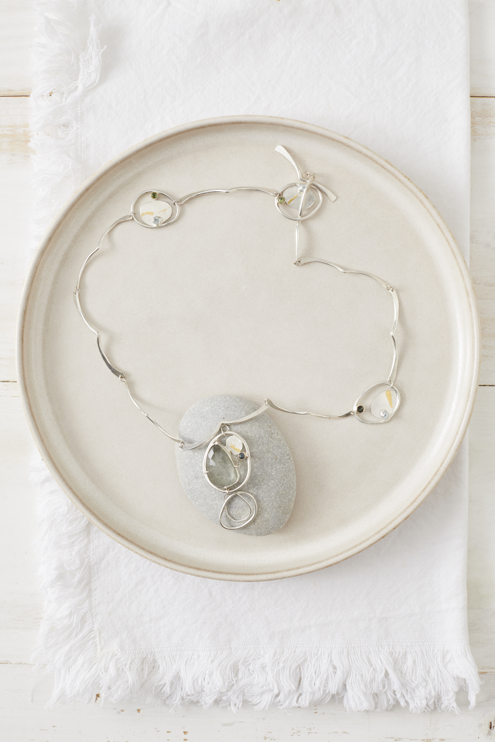 Becca Charlo’s Bay Necklace is inspired by the ever-changing coastline of the Isle of Wight, where shifting tides shape the land through time, erosion and movement. Observing the natural rhythm of the sea, she translates these fluid forms into a series of interconnected elements that echo the gentle rise and fall of waves.