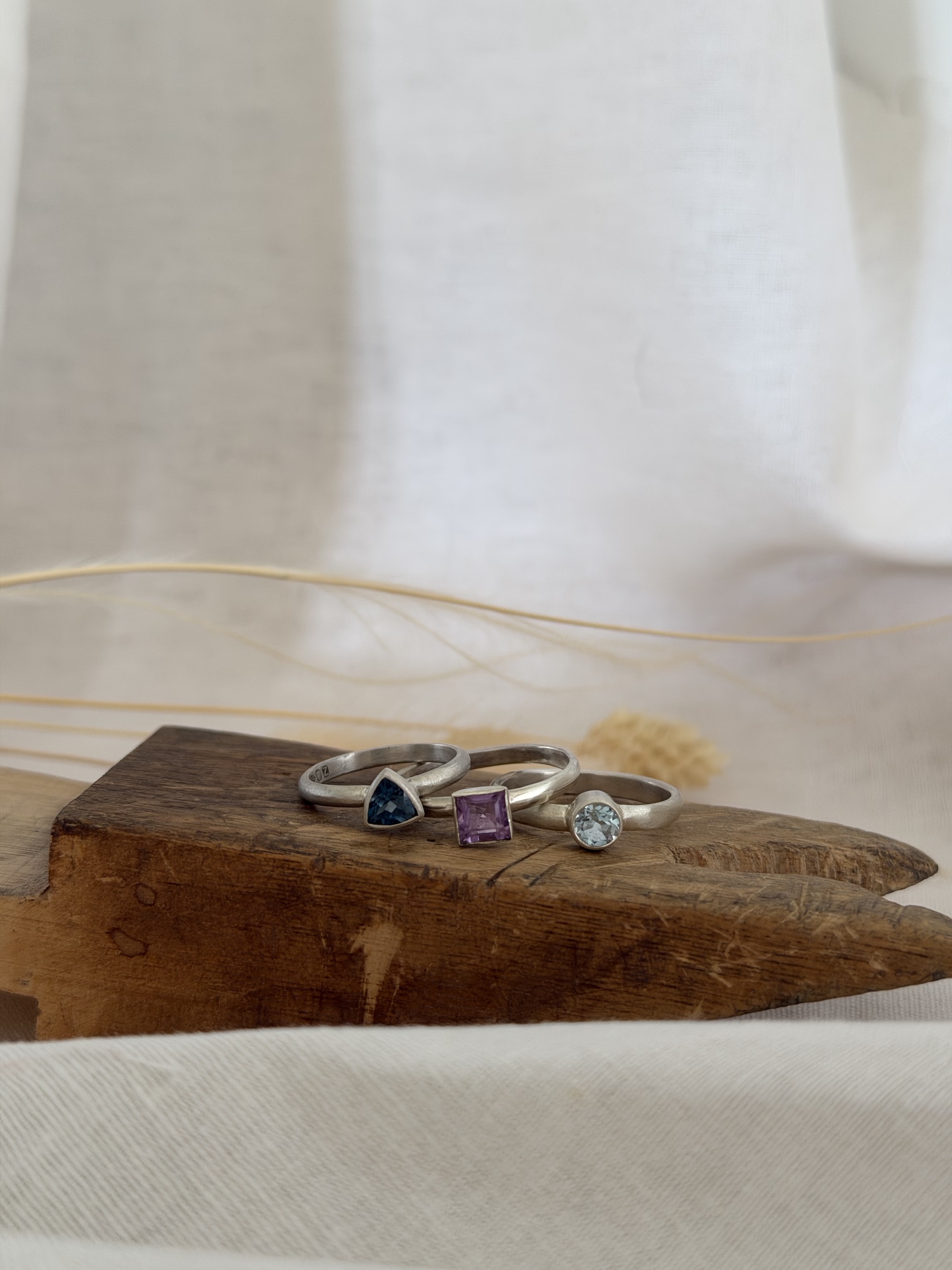 At the top of the stack sits a striking trillion-cut London Blue Topaz – bold angles and deep ocean tones that catch the light beautifully.
